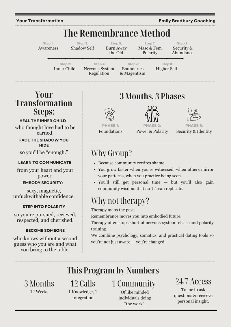 Whether you’re at the very beginning of your healing journey and have no idea what attachment theory, the inner child, or the shadow self even mean — or you’re a seasoned pro who wants to break through your next ceiling — this container is for you. REMEMBRANCE meets you where you are and helps you move to the next level of emotional mastery and self-worth.